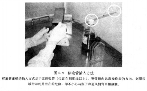 (a)如果是玻璃吸管,從盒中取出吸管時.要保持待取吸管在盒中與其他吸管平行,并盡叮能少地接觸他們,特別是吸管頭部,如果拿著的吸管接觸了其他仍在盒內的吸管尾端.則不能再使用它;把吸管插人移液器中,吸竹指向你的外側,握在刻度上面部分,這樣,吸管進人試劑瓶或培養瓶的部分將不會被污染(圖6.9).